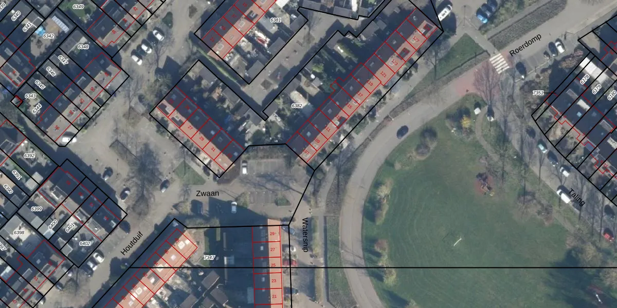 Het perceel waarop Roerdomp 107 staat heeft een oppervlakte van 2215 m². Dit is een zeer groot perceel. De perceeloppervlakte wordt geregistreerd door het Kadaster. Gedetailleerde informatie over de maten van dit perceel kunt u vinden in het rapport Kadastrale kaart met maatvoering van Roerdomp 107.