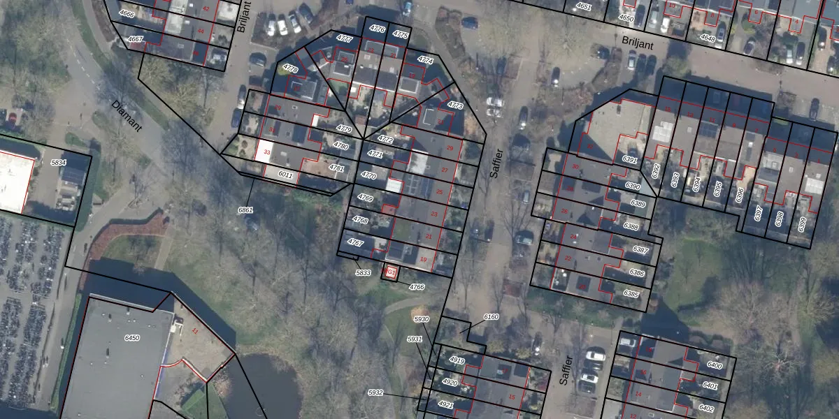 Het perceel waarop Saffier 23 staat heeft een oppervlakte van 152 m². Dit is een middelgroot perceel. De perceeloppervlakte wordt geregistreerd door het Kadaster. Gedetailleerde informatie over de maten van dit perceel kunt u vinden in het rapport Kadastrale kaart met maatvoering van Saffier 23.