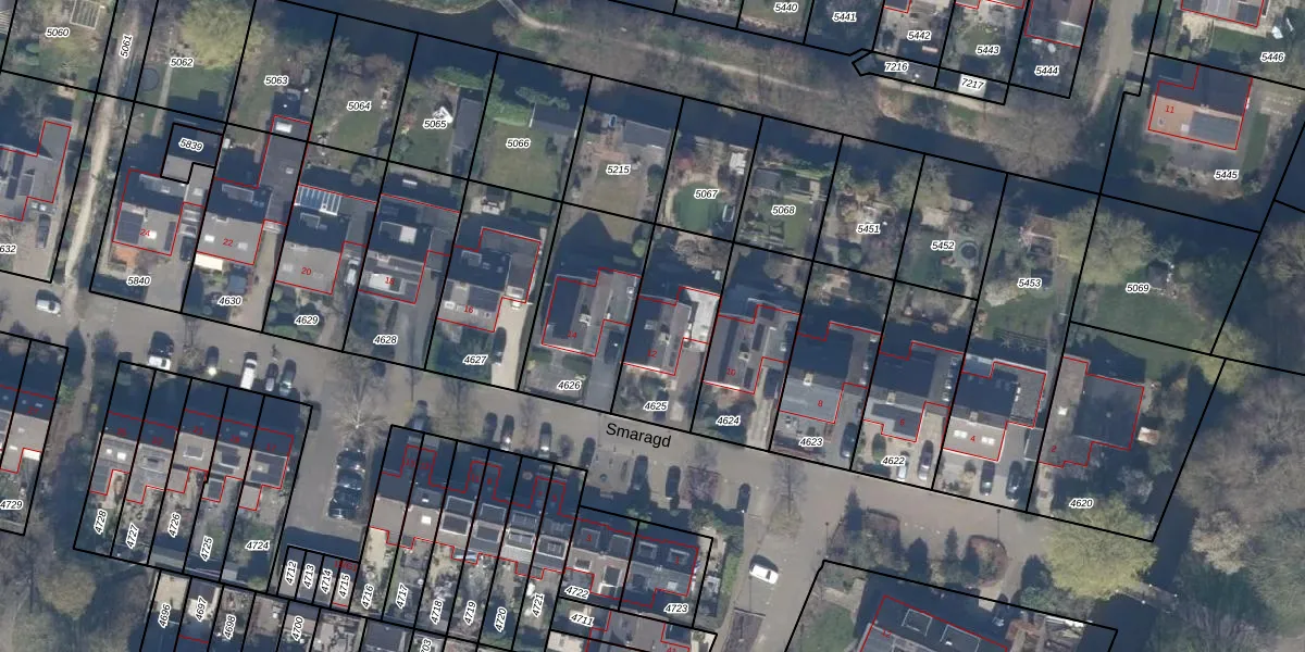 Het perceel waarop Smaragd 12 staat heeft een oppervlakte van 376 m². Dit is een groot perceel. De perceeloppervlakte wordt geregistreerd door het Kadaster. Gedetailleerde informatie over de maten van dit perceel kunt u vinden in het rapport Kadastrale kaart met maatvoering van Smaragd 12.