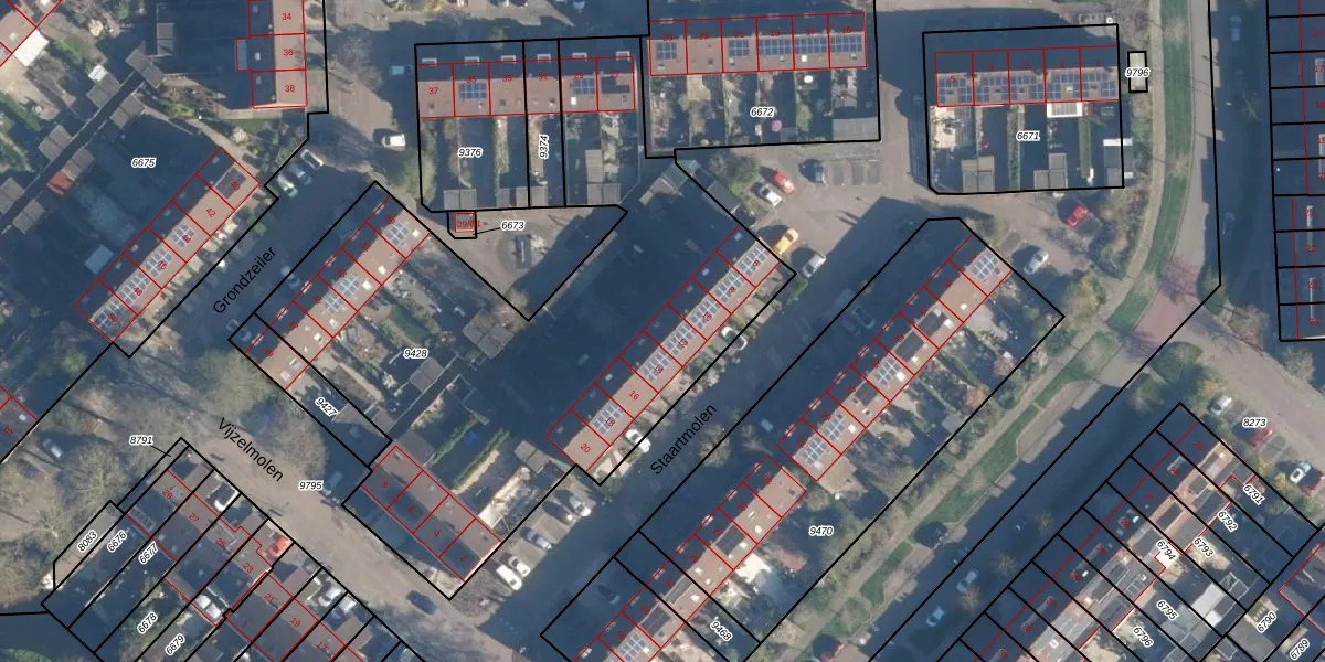 Het perceel waarop Staartmolen 12 staat heeft een oppervlakte van 2860 m². Dit is een zeer groot perceel. De perceeloppervlakte wordt geregistreerd door het Kadaster. Gedetailleerde informatie over de maten van dit perceel kunt u vinden in het rapport Kadastrale kaart met maatvoering van Staartmolen 12.