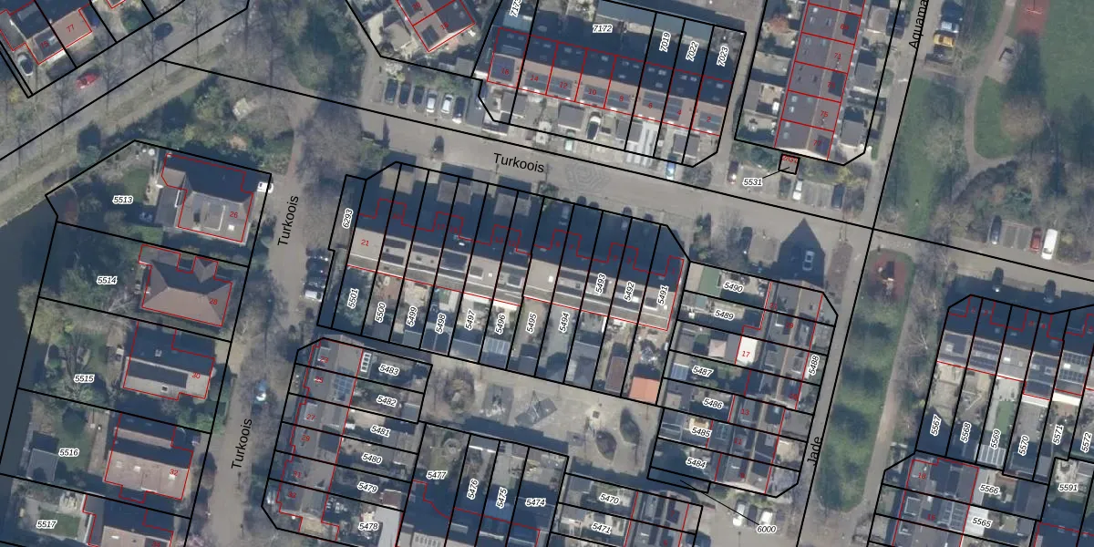 Het perceel waarop Turkoois 9 staat heeft een oppervlakte van 174 m². Dit is een middelgroot perceel. De perceeloppervlakte wordt geregistreerd door het Kadaster. Gedetailleerde informatie over de maten van dit perceel kunt u vinden in het rapport Kadastrale kaart met maatvoering van Turkoois 9.