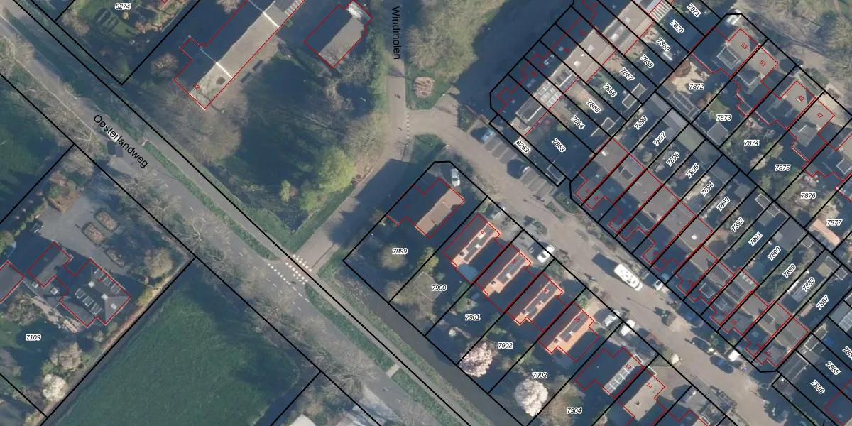 Het perceel waarop Windmolen 2 staat heeft een oppervlakte van 493 m². Dit is een groot perceel. De perceeloppervlakte wordt geregistreerd door het Kadaster. Gedetailleerde informatie over de maten van dit perceel kunt u vinden in het rapport Kadastrale kaart met maatvoering van Windmolen 2.