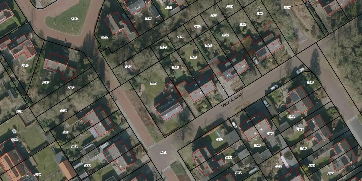Het perceel waarop Verzetslaan 19 staat heeft een oppervlakte van 418 m². Dit is een groot perceel. De perceeloppervlakte wordt geregistreerd door het Kadaster. Gedetailleerde informatie over de maten van dit perceel kunt u vinden in het rapport Kadastrale kaart met maatvoering van Verzetslaan 19.