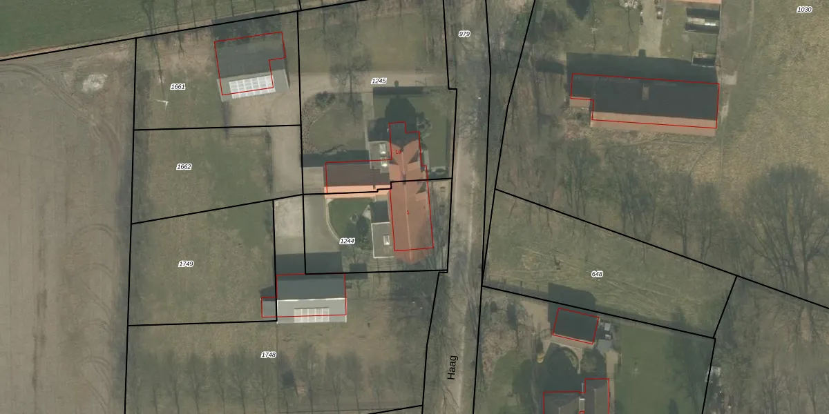 Het perceel waarop Haag 1 staat heeft een oppervlakte van 715 m². Dit is een groot perceel. De perceeloppervlakte wordt geregistreerd door het Kadaster. Gedetailleerde informatie over de maten van dit perceel kunt u vinden in het rapport Kadastrale kaart met maatvoering van Haag 1.