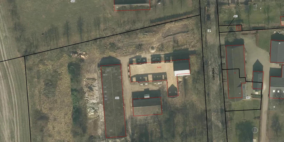 Het perceel waarop Hoeven 12 staat heeft een oppervlakte van 1,1 ha. Dit is een zeer groot perceel. De perceeloppervlakte wordt geregistreerd door het Kadaster. Gedetailleerde informatie over de maten van dit perceel kunt u vinden in het rapport Kadastrale kaart met maatvoering van Hoeven 12.