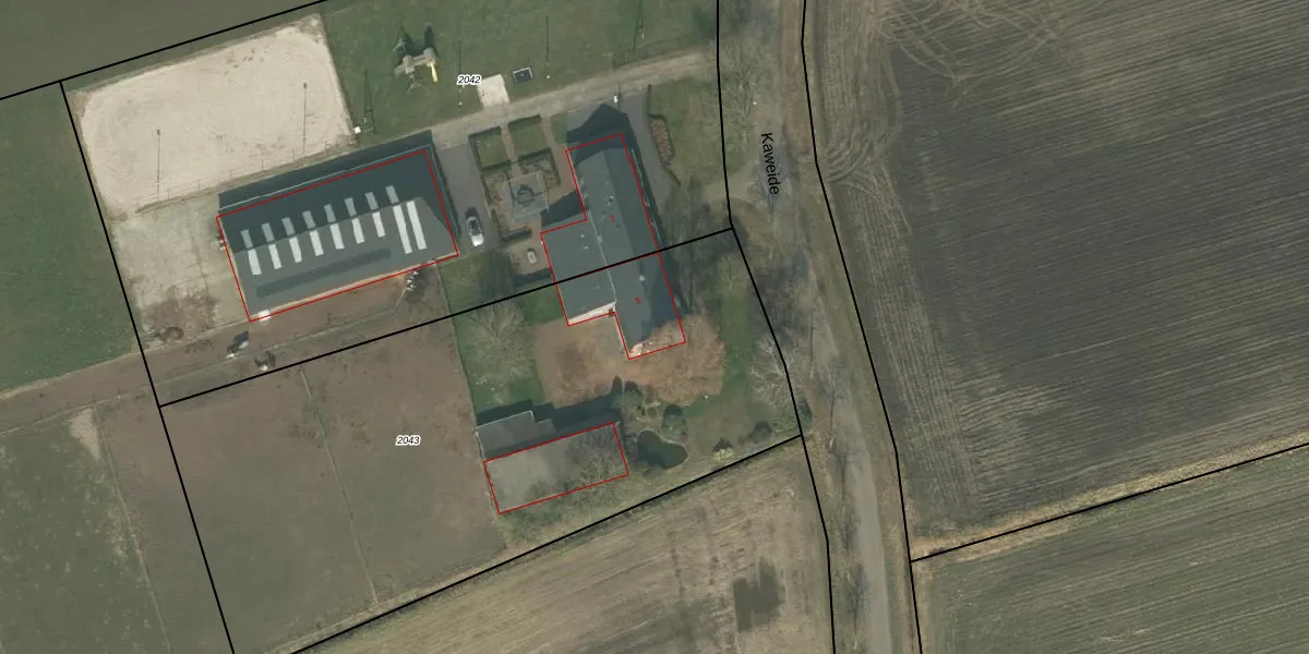 Kaweide 5 is gelegen op kadastraal perceel BKL02C2043. Deze kadastrale aanduiding is uniek en wordt gebruikt door het Kadaster om eigendomsrechten en andere zakelijke rechten vast te leggen. Het perceel maakt onderdeel uit van de kadastrale gemeente Bakel en Milheeze.