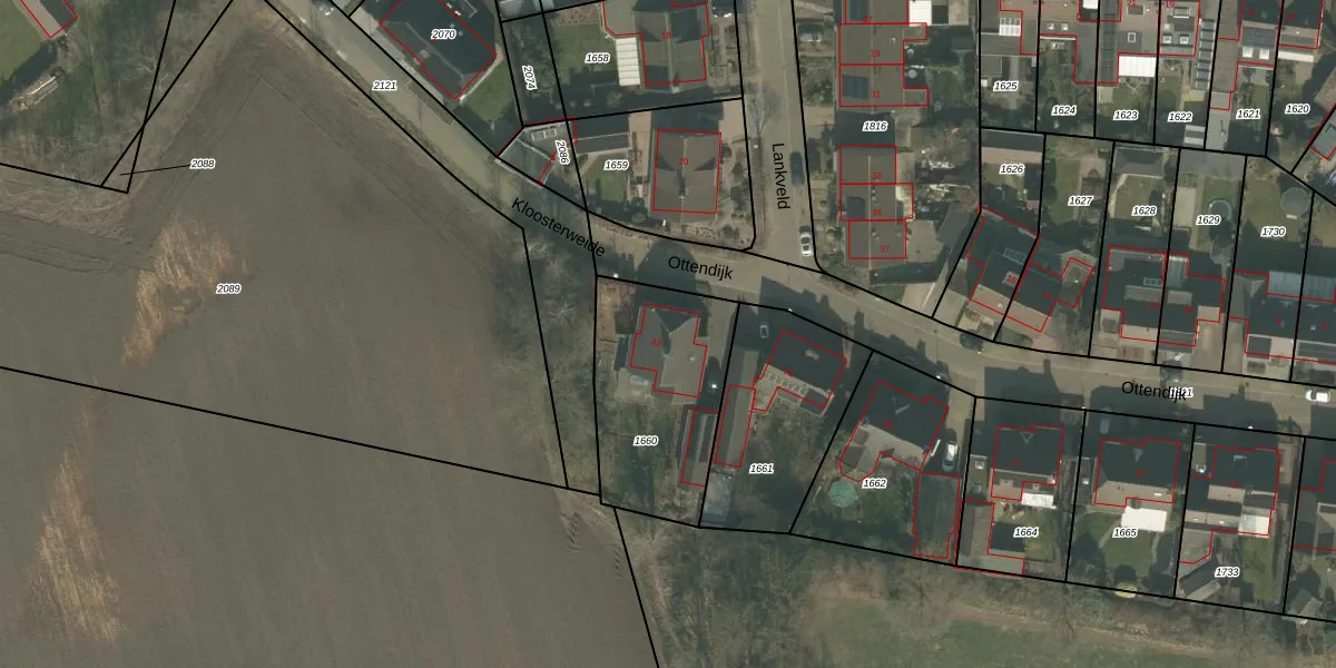 Het perceel waarop Ottendijk 33 staat heeft een oppervlakte van 634 m². Dit is een groot perceel. De perceeloppervlakte wordt geregistreerd door het Kadaster. Gedetailleerde informatie over de maten van dit perceel kunt u vinden in het rapport Kadastrale kaart met maatvoering van Ottendijk 33.