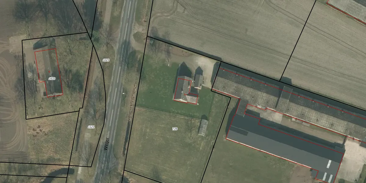 Het perceel waarop Weijer 14 staat heeft een oppervlakte van 3365 m². Dit is een zeer groot perceel. De perceeloppervlakte wordt geregistreerd door het Kadaster. Gedetailleerde informatie over de maten van dit perceel kunt u vinden in het rapport Kadastrale kaart met maatvoering van Weijer 14.