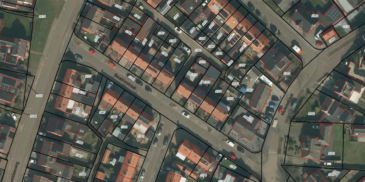 Beatrixstraat 38 is gelegen op kadastraal perceel MIL00G1772. Deze kadastrale aanduiding is uniek en wordt gebruikt door het Kadaster om eigendomsrechten en andere zakelijke rechten vast te leggen. Het perceel maakt onderdeel uit van de kadastrale gemeente Mill.