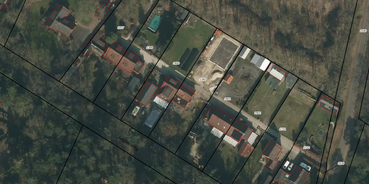 Het perceel waarop Borneoweg 15 staat heeft een oppervlakte van 1215 m². Dit is een zeer groot perceel. De perceeloppervlakte wordt geregistreerd door het Kadaster. Gedetailleerde informatie over de maten van dit perceel kunt u vinden in het rapport Kadastrale kaart met maatvoering van Borneoweg 15.