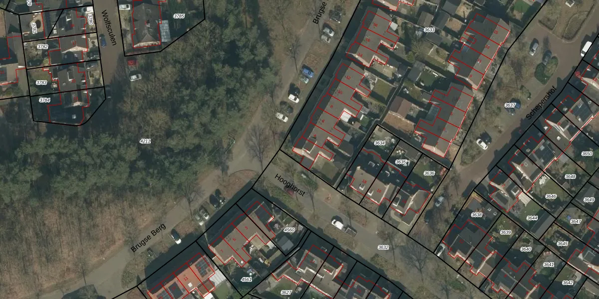 Het perceel waarop Brugse Berg 2 staat heeft een oppervlakte van 4758 m². Dit is een zeer groot perceel. De perceeloppervlakte wordt geregistreerd door het Kadaster. Gedetailleerde informatie over de maten van dit perceel kunt u vinden in het rapport Kadastrale kaart met maatvoering van Brugse Berg 2.