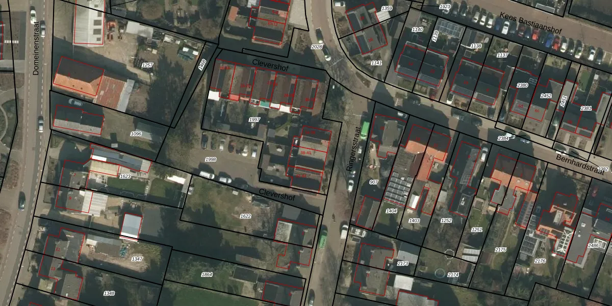 Het perceel waarop Clevershof 38 staat heeft een oppervlakte van 1405 m². Dit is een zeer groot perceel. De perceeloppervlakte wordt geregistreerd door het Kadaster. Gedetailleerde informatie over de maten van dit perceel kunt u vinden in het rapport Kadastrale kaart met maatvoering van Clevershof 38.
