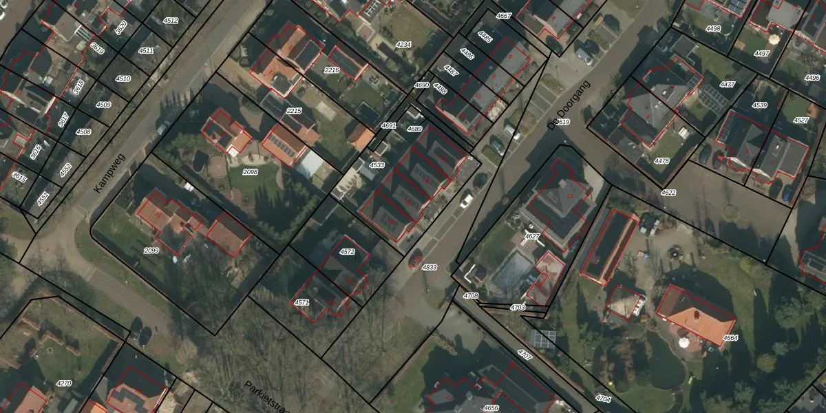 Het perceel waarop De Doorgang 18 staat heeft een oppervlakte van 670 m². Dit is een groot perceel. De perceeloppervlakte wordt geregistreerd door het Kadaster. Gedetailleerde informatie over de maten van dit perceel kunt u vinden in het rapport Kadastrale kaart met maatvoering van De Doorgang 18.