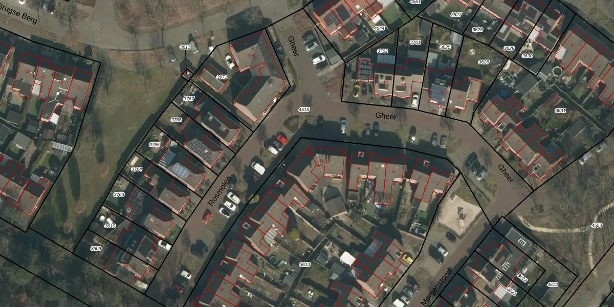 Gheer 15 is gelegen op kadastraal perceel MIL00F3613. Deze kadastrale aanduiding is uniek en wordt gebruikt door het Kadaster om eigendomsrechten en andere zakelijke rechten vast te leggen. Het perceel maakt onderdeel uit van de kadastrale gemeente Mill.