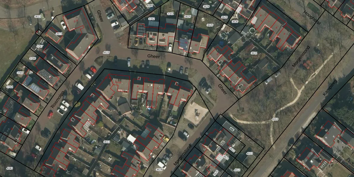 Het perceel waarop Gheer 3 staat heeft een oppervlakte van 4315 m². Dit is een zeer groot perceel. De perceeloppervlakte wordt geregistreerd door het Kadaster. Gedetailleerde informatie over de maten van dit perceel kunt u vinden in het rapport Kadastrale kaart met maatvoering van Gheer 3.