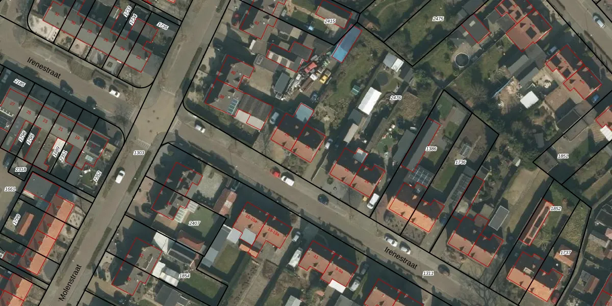 Irenestraat 18 is gelegen op kadastraal perceel MIL00G2476. Deze kadastrale aanduiding is uniek en wordt gebruikt door het Kadaster om eigendomsrechten en andere zakelijke rechten vast te leggen. Het perceel maakt onderdeel uit van de kadastrale gemeente Mill.
