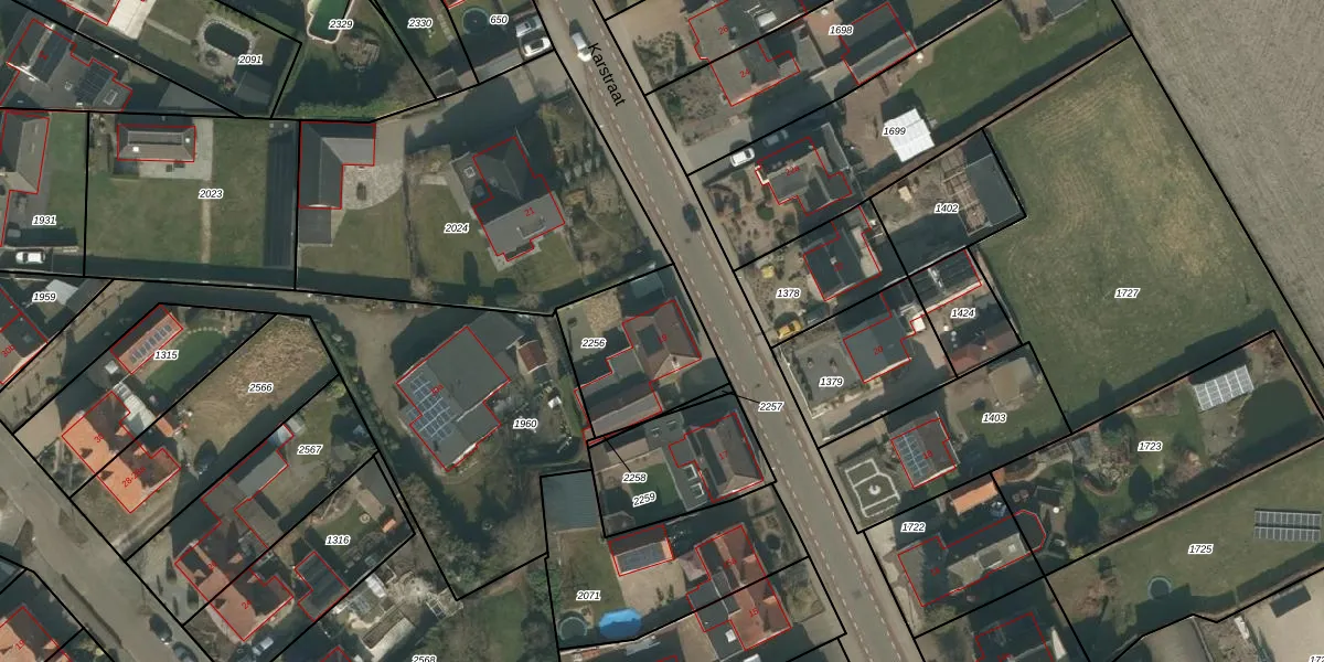 Karstraat 19 is gelegen op kadastraal perceel MIL00G2256. Deze kadastrale aanduiding is uniek en wordt gebruikt door het Kadaster om eigendomsrechten en andere zakelijke rechten vast te leggen. Het perceel maakt onderdeel uit van de kadastrale gemeente Mill.