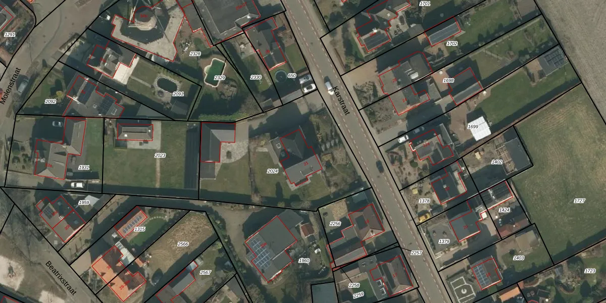 Karstraat 21 is gelegen op kadastraal perceel MIL00G2024. Deze kadastrale aanduiding is uniek en wordt gebruikt door het Kadaster om eigendomsrechten en andere zakelijke rechten vast te leggen. Het perceel maakt onderdeel uit van de kadastrale gemeente Mill.
