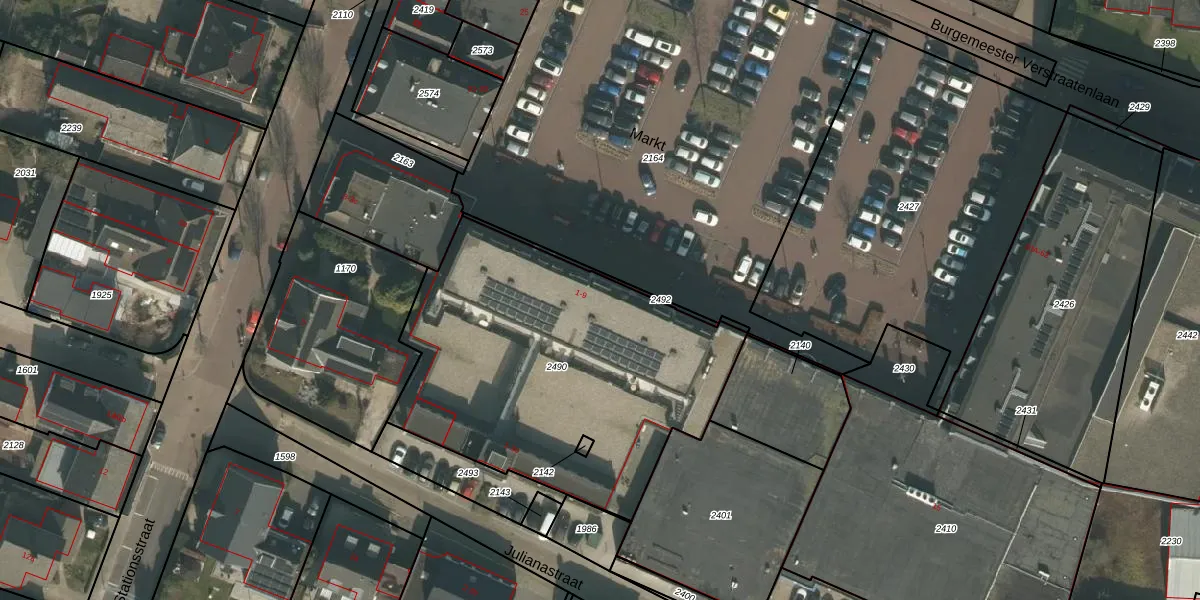 Het perceel waarop Markt 5 staat heeft een oppervlakte van 1744 m². Dit is een zeer groot perceel. De perceeloppervlakte wordt geregistreerd door het Kadaster. Gedetailleerde informatie over de maten van dit perceel kunt u vinden in het rapport Kadastrale kaart met maatvoering van Markt 5.
