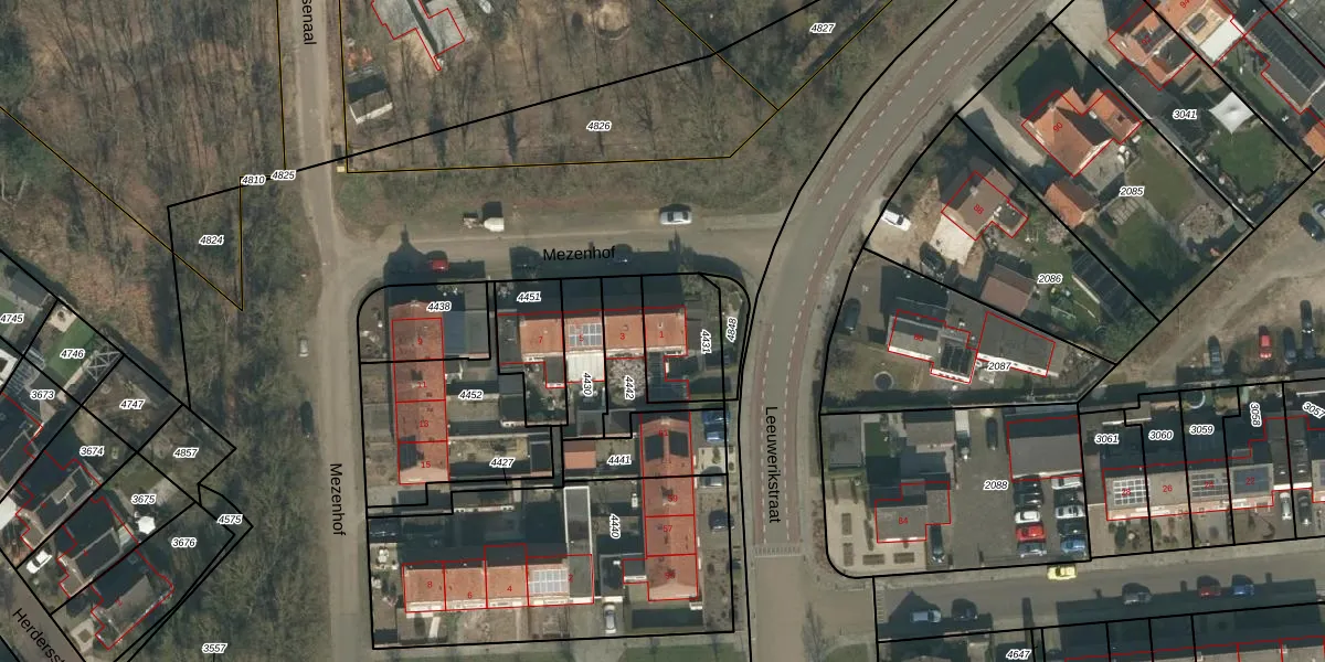 Mezenhof 1 is gelegen op kadastraal perceel MIL00F4431. Deze kadastrale aanduiding is uniek en wordt gebruikt door het Kadaster om eigendomsrechten en andere zakelijke rechten vast te leggen. Het perceel maakt onderdeel uit van de kadastrale gemeente Mill.