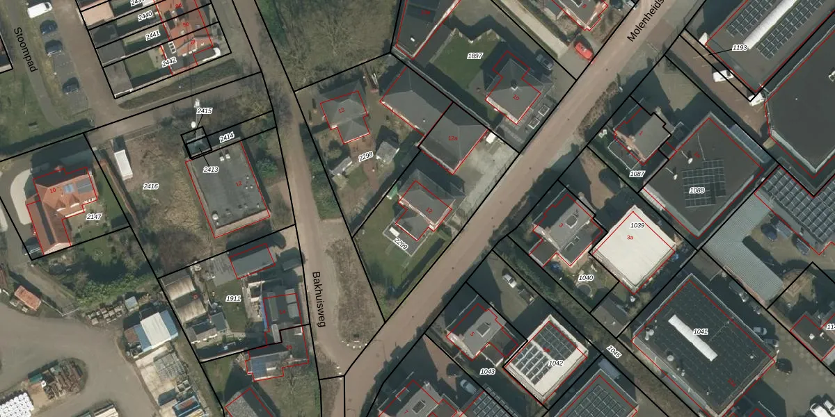 Molenheidseweg 12 is gelegen op kadastraal perceel MIL00D2299. Deze kadastrale aanduiding is uniek en wordt gebruikt door het Kadaster om eigendomsrechten en andere zakelijke rechten vast te leggen. Het perceel maakt onderdeel uit van de kadastrale gemeente Mill.