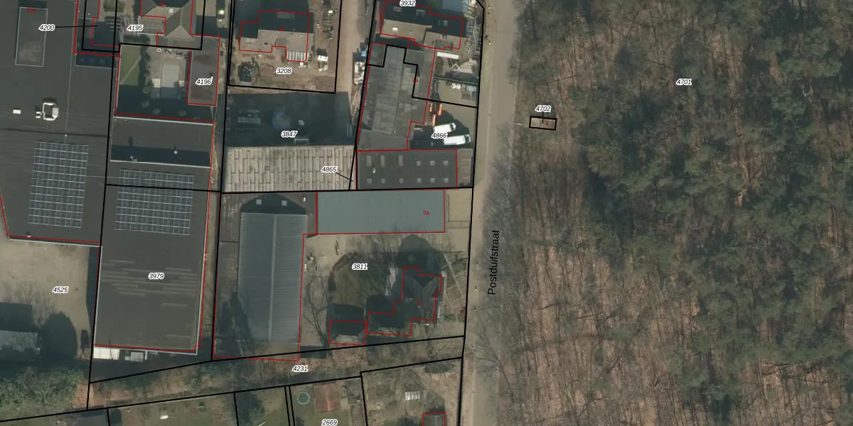Postduifstraat 3-a is gelegen op kadastraal perceel MIL00F3811. Deze kadastrale aanduiding is uniek en wordt gebruikt door het Kadaster om eigendomsrechten en andere zakelijke rechten vast te leggen. Het perceel maakt onderdeel uit van de kadastrale gemeente Mill.