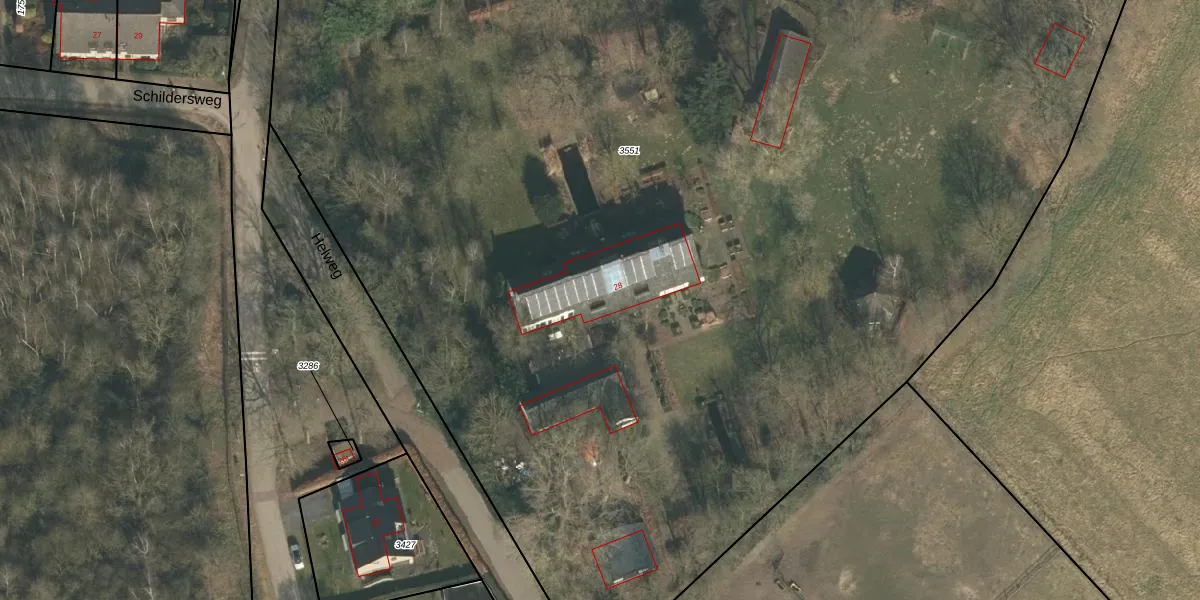 Het perceel waarop Helweg 28 staat heeft een oppervlakte van 1,2 ha. Dit is een zeer groot perceel. De perceeloppervlakte wordt geregistreerd door het Kadaster. Gedetailleerde informatie over de maten van dit perceel kunt u vinden in het rapport Kadastrale kaart met maatvoering van Helweg 28.
