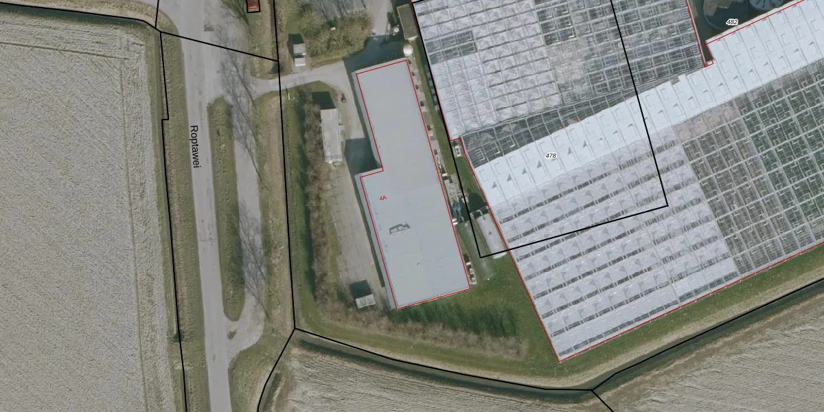 Het perceel waarop Roptawei 4-A staat heeft een oppervlakte van 2,5 ha. Dit is een zeer groot perceel. De perceeloppervlakte wordt geregistreerd door het Kadaster. Gedetailleerde informatie over de maten van dit perceel kunt u vinden in het rapport Kadastrale kaart met maatvoering van Roptawei 4-A.