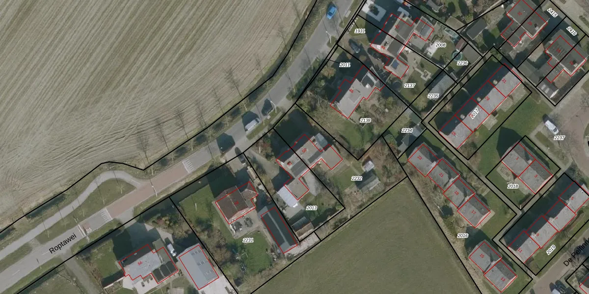 Roptawei 50 is gelegen op kadastraal perceel NKK02C2232. Deze kadastrale aanduiding is uniek en wordt gebruikt door het Kadaster om eigendomsrechten en andere zakelijke rechten vast te leggen. Het perceel maakt onderdeel uit van de kadastrale gemeente Nijkerk Friesland.