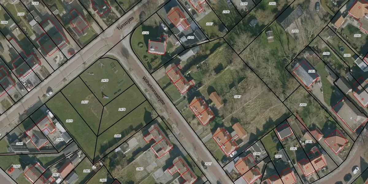 Het perceel waarop Wilhelminastrjitte 13 staat heeft een oppervlakte van 2800 m². Dit is een zeer groot perceel. De perceeloppervlakte wordt geregistreerd door het Kadaster. Gedetailleerde informatie over de maten van dit perceel kunt u vinden in het rapport Kadastrale kaart met maatvoering van Wilhelminastrjitte 13.