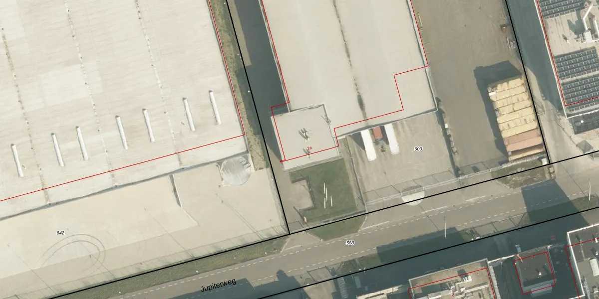 Het perceel waarop Jupiterweg 1-a staat heeft een oppervlakte van 1,3 ha. Dit is een zeer groot perceel. De perceeloppervlakte wordt geregistreerd door het Kadaster. Gedetailleerde informatie over de maten van dit perceel kunt u vinden in het rapport Kadastrale kaart met maatvoering van Jupiterweg 1-a.