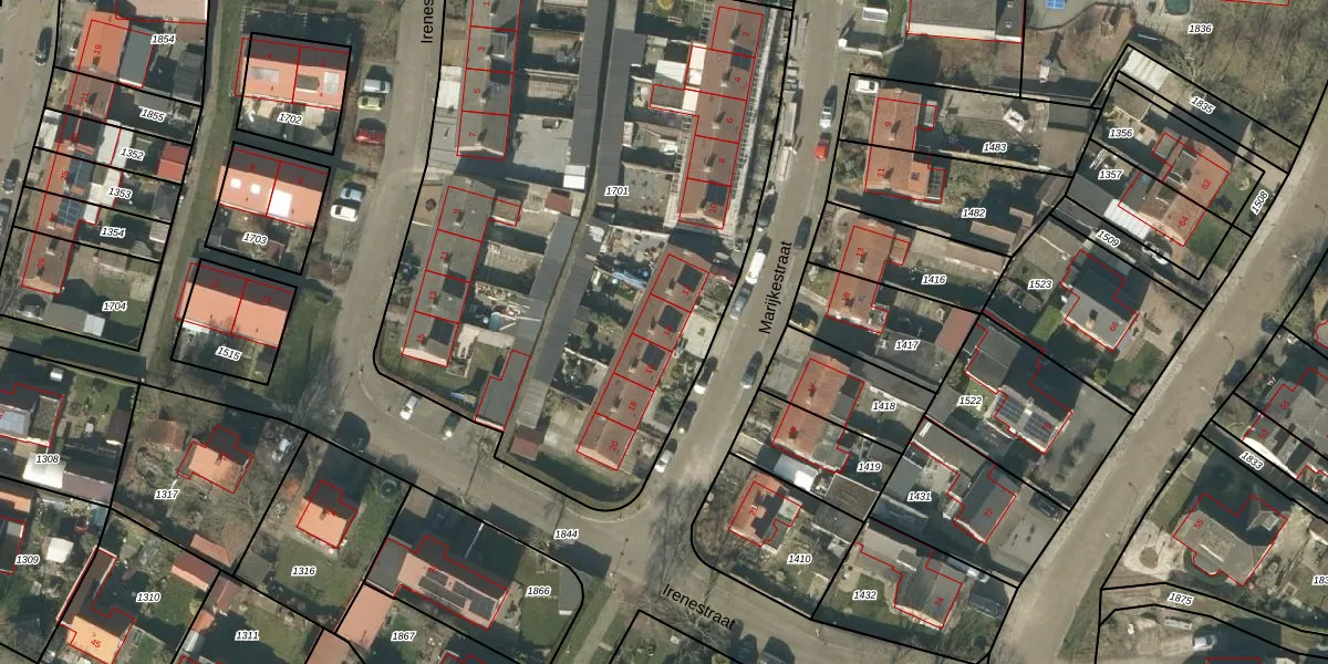 Het perceel waarop Marijkestraat 14 staat heeft een oppervlakte van 3580 m². Dit is een zeer groot perceel. De perceeloppervlakte wordt geregistreerd door het Kadaster. Gedetailleerde informatie over de maten van dit perceel kunt u vinden in het rapport Kadastrale kaart met maatvoering van Marijkestraat 14.