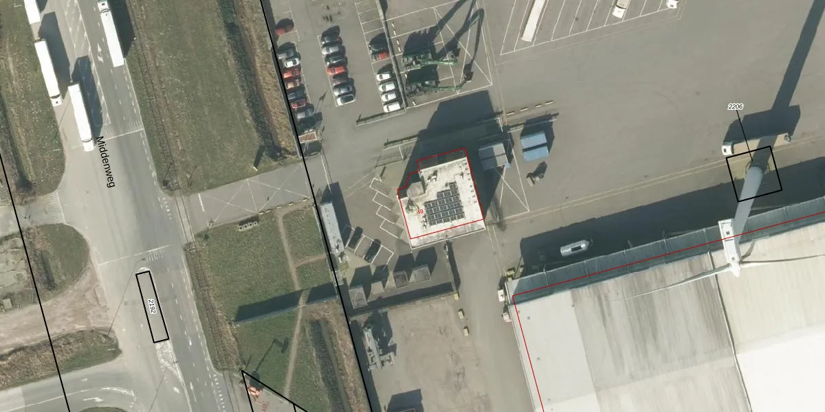 Het perceel waarop Middenweg 49 staat heeft een oppervlakte van 9,6 ha. Dit is een zeer groot perceel. De perceeloppervlakte wordt geregistreerd door het Kadaster. Gedetailleerde informatie over de maten van dit perceel kunt u vinden in het rapport Kadastrale kaart met maatvoering van Middenweg 49.