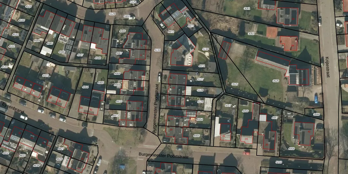 Burgemeester Poortstraat 13 is gelegen op kadastraal perceel MGT01A5128. Deze kadastrale aanduiding is uniek en wordt gebruikt door het Kadaster om eigendomsrechten en andere zakelijke rechten vast te leggen. Het perceel maakt onderdeel uit van de kadastrale gemeente Moergestel.