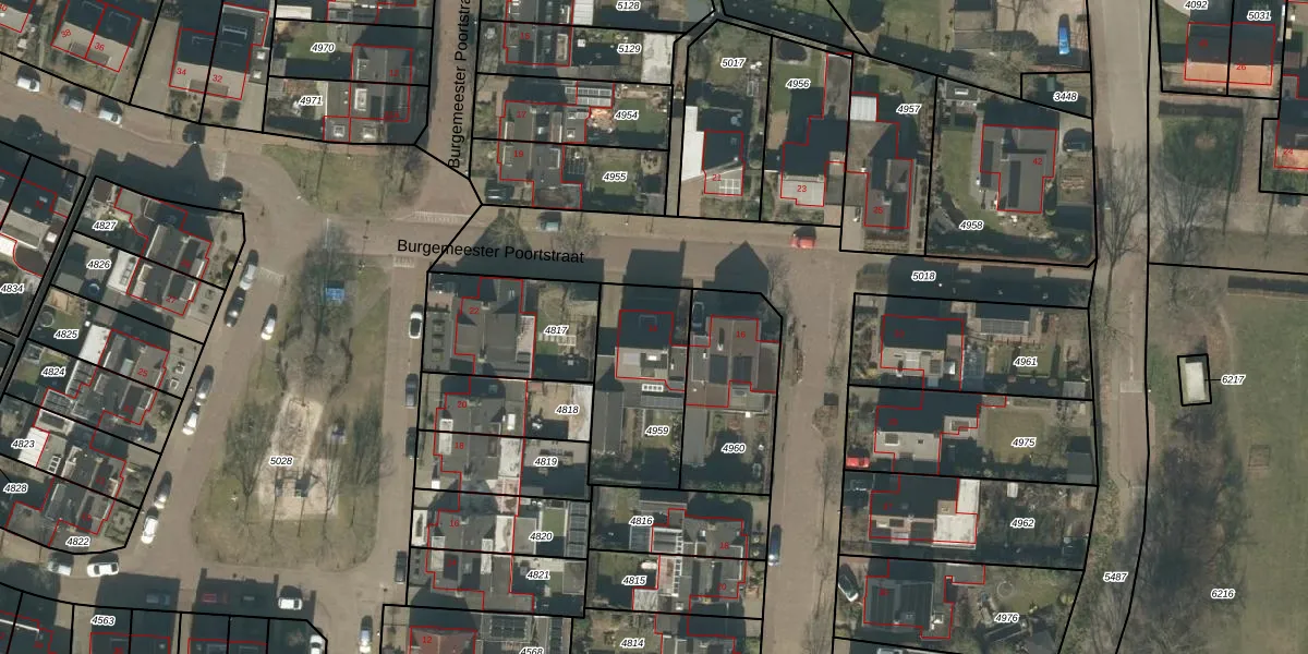 Het perceel waarop Burgemeester Poortstraat 14 staat heeft een oppervlakte van 433 m². Dit is een groot perceel. De perceeloppervlakte wordt geregistreerd door het Kadaster. Gedetailleerde informatie over de maten van dit perceel kunt u vinden in het rapport Kadastrale kaart met maatvoering van Burgemeester Poortstraat 14.