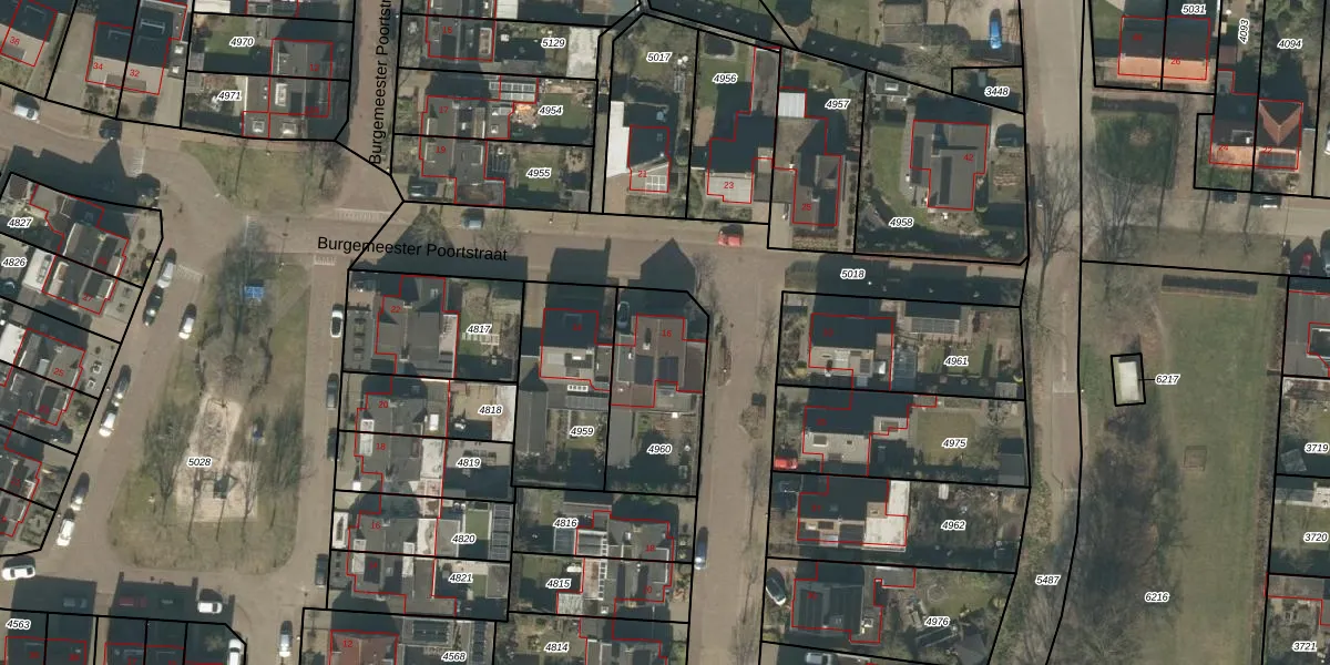 Het perceel waarop Burgemeester Poortstraat 16 staat heeft een oppervlakte van 425 m². Dit is een groot perceel. De perceeloppervlakte wordt geregistreerd door het Kadaster. Gedetailleerde informatie over de maten van dit perceel kunt u vinden in het rapport Kadastrale kaart met maatvoering van Burgemeester Poortstraat 16.