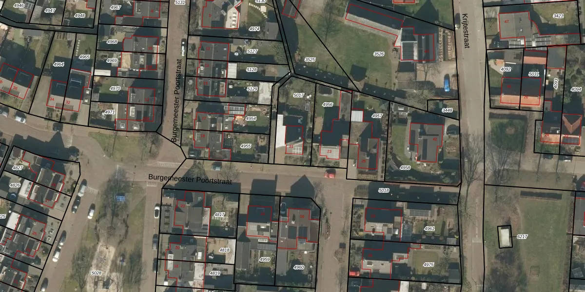 Burgemeester Poortstraat 21 is gelegen op kadastraal perceel MGT01A5017. Deze kadastrale aanduiding is uniek en wordt gebruikt door het Kadaster om eigendomsrechten en andere zakelijke rechten vast te leggen. Het perceel maakt onderdeel uit van de kadastrale gemeente Moergestel.
