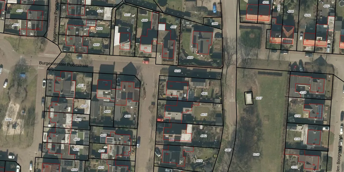 Het perceel waarop Burgemeester Poortstraat 33 staat heeft een oppervlakte van 512 m². Dit is een groot perceel. De perceeloppervlakte wordt geregistreerd door het Kadaster. Gedetailleerde informatie over de maten van dit perceel kunt u vinden in het rapport Kadastrale kaart met maatvoering van Burgemeester Poortstraat 33.
