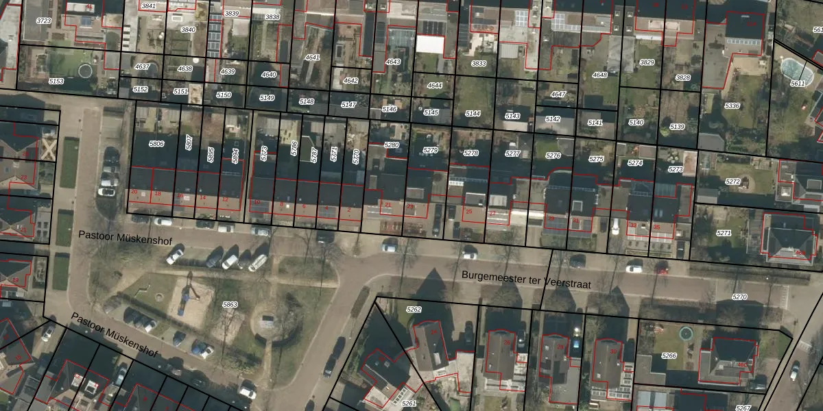Burgemeester ter Veerstraat 23 is gelegen op kadastraal perceel MGT01A5279. Deze kadastrale aanduiding is uniek en wordt gebruikt door het Kadaster om eigendomsrechten en andere zakelijke rechten vast te leggen. Het perceel maakt onderdeel uit van de kadastrale gemeente Moergestel.