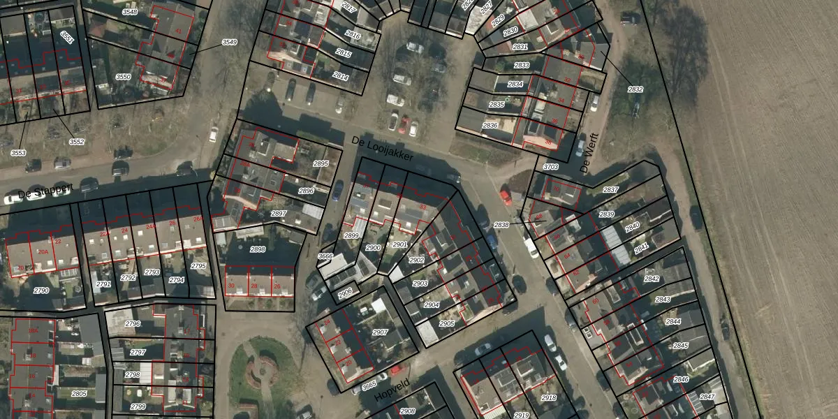 Het perceel waarop De Looijakker 33 staat heeft een oppervlakte van 197 m². Dit is een middelgroot perceel. De perceeloppervlakte wordt geregistreerd door het Kadaster. Gedetailleerde informatie over de maten van dit perceel kunt u vinden in het rapport Kadastrale kaart met maatvoering van De Looijakker 33.