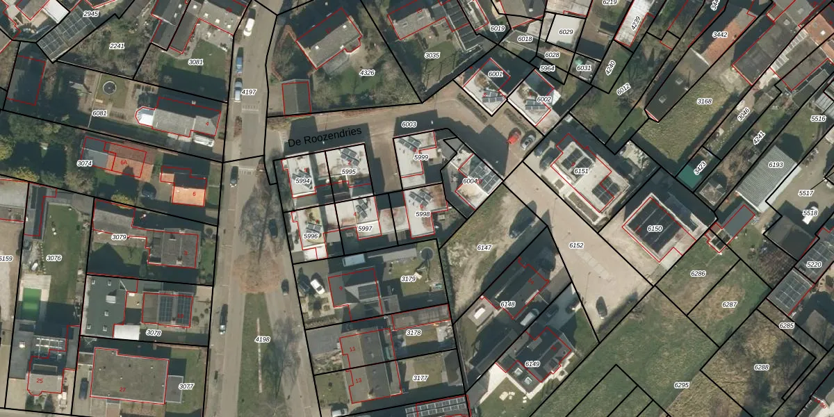 De Roozendries 6 is gelegen op kadastraal perceel MGT01A5998. Deze kadastrale aanduiding is uniek en wordt gebruikt door het Kadaster om eigendomsrechten en andere zakelijke rechten vast te leggen. Het perceel maakt onderdeel uit van de kadastrale gemeente Moergestel.