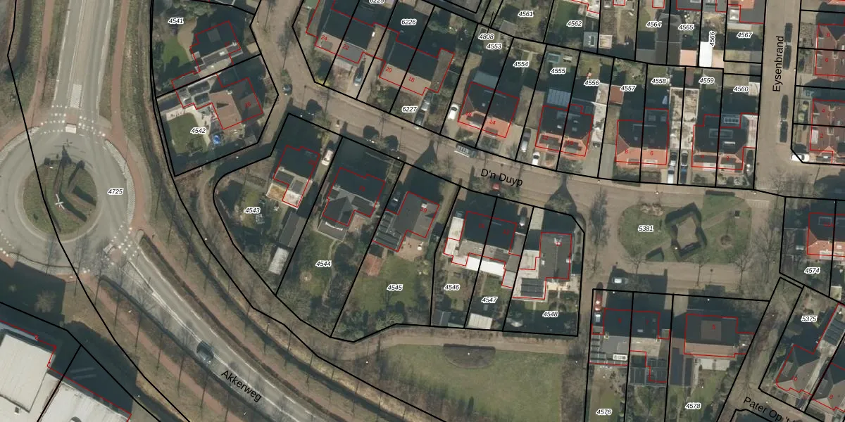 Het perceel waarop D'n Duyp 19 staat heeft een oppervlakte van 662 m². Dit is een groot perceel. De perceeloppervlakte wordt geregistreerd door het Kadaster. Gedetailleerde informatie over de maten van dit perceel kunt u vinden in het rapport Kadastrale kaart met maatvoering van D'n Duyp 19.