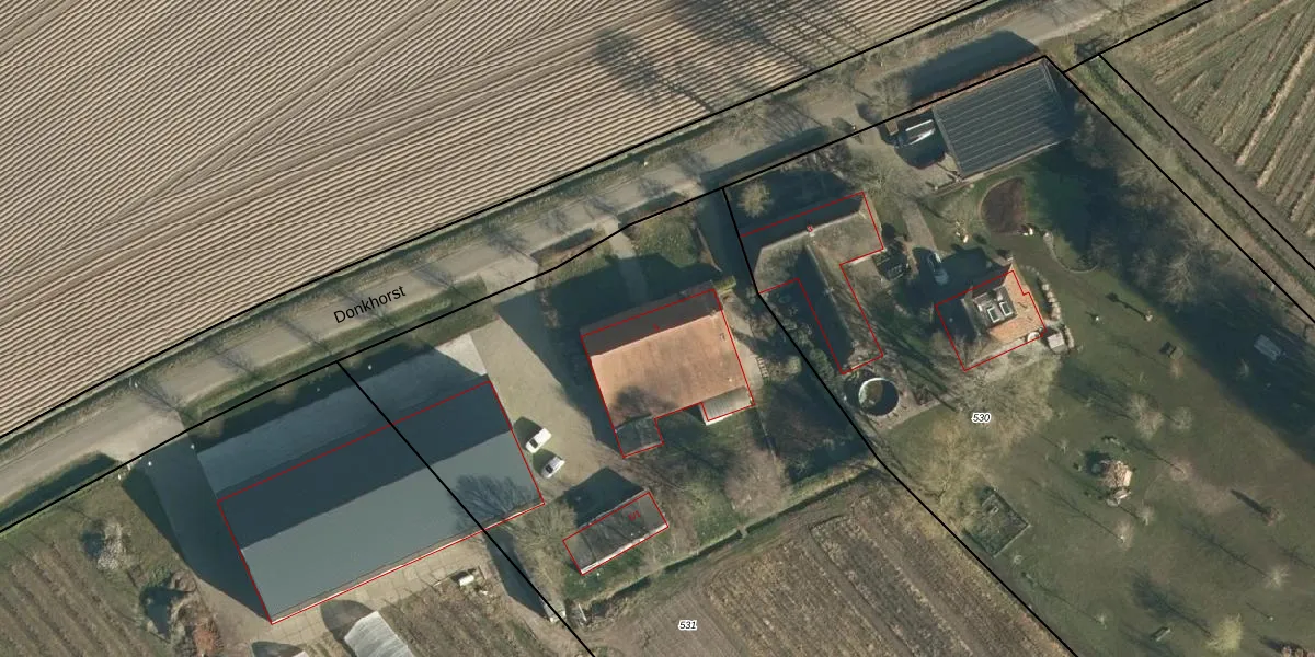 Het perceel waarop Donkhorst 5 staat heeft een oppervlakte van 1,1 ha. Dit is een zeer groot perceel. De perceeloppervlakte wordt geregistreerd door het Kadaster. Gedetailleerde informatie over de maten van dit perceel kunt u vinden in het rapport Kadastrale kaart met maatvoering van Donkhorst 5.