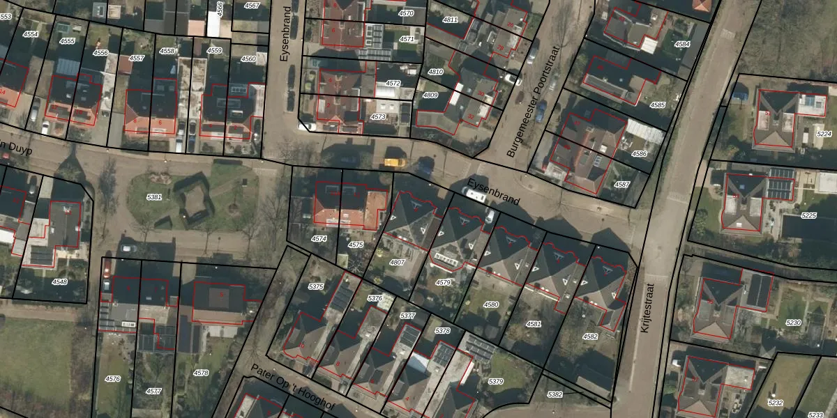 Eysenbrand 9 is gelegen op kadastraal perceel MGT01A4807. Deze kadastrale aanduiding is uniek en wordt gebruikt door het Kadaster om eigendomsrechten en andere zakelijke rechten vast te leggen. Het perceel maakt onderdeel uit van de kadastrale gemeente Moergestel.