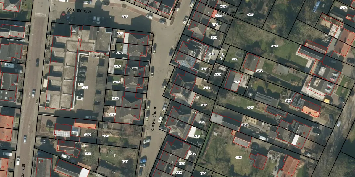 Het perceel waarop Korenschuur 19 staat heeft een oppervlakte van 261 m². Dit is een middelgroot perceel. De perceeloppervlakte wordt geregistreerd door het Kadaster. Gedetailleerde informatie over de maten van dit perceel kunt u vinden in het rapport Kadastrale kaart met maatvoering van Korenschuur 19.