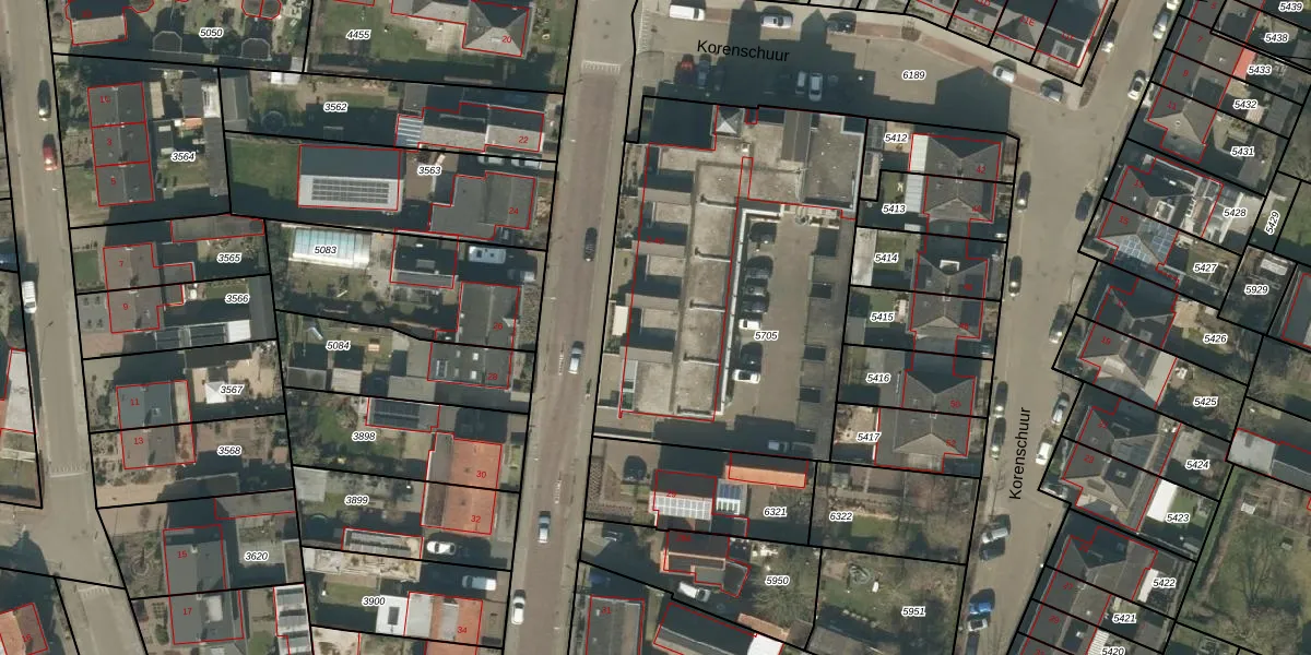 Korenschuur 20 is gelegen op kadastraal perceel MGT01A5705. Deze kadastrale aanduiding is uniek en wordt gebruikt door het Kadaster om eigendomsrechten en andere zakelijke rechten vast te leggen. Het perceel maakt onderdeel uit van de kadastrale gemeente Moergestel.