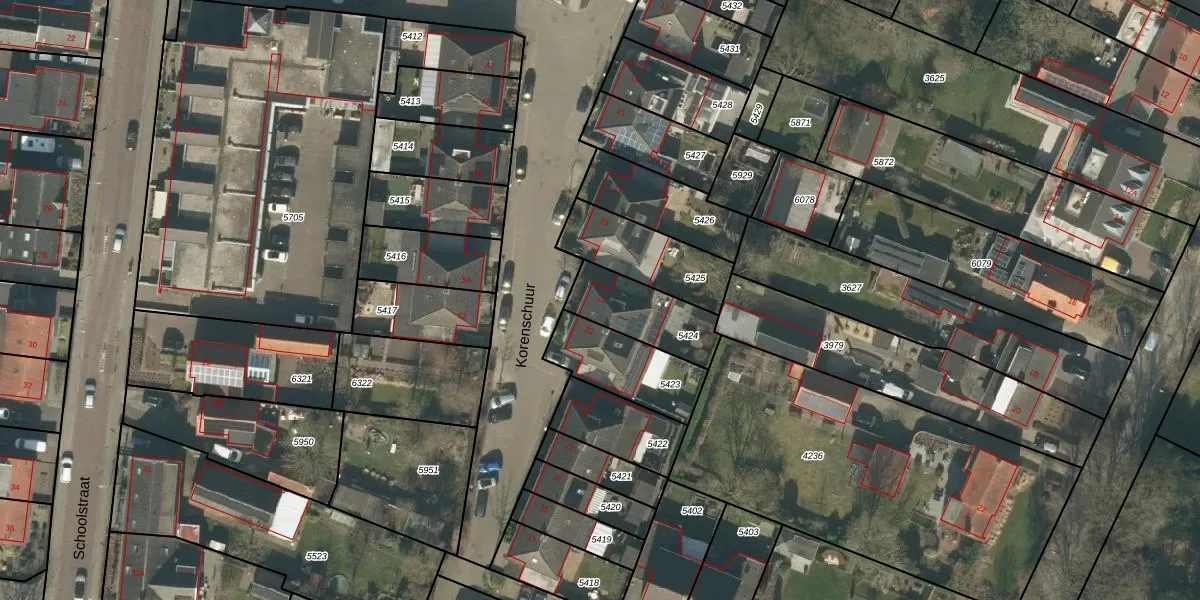 Korenschuur 21 is gelegen op kadastraal perceel MGT01A5424. Deze kadastrale aanduiding is uniek en wordt gebruikt door het Kadaster om eigendomsrechten en andere zakelijke rechten vast te leggen. Het perceel maakt onderdeel uit van de kadastrale gemeente Moergestel.