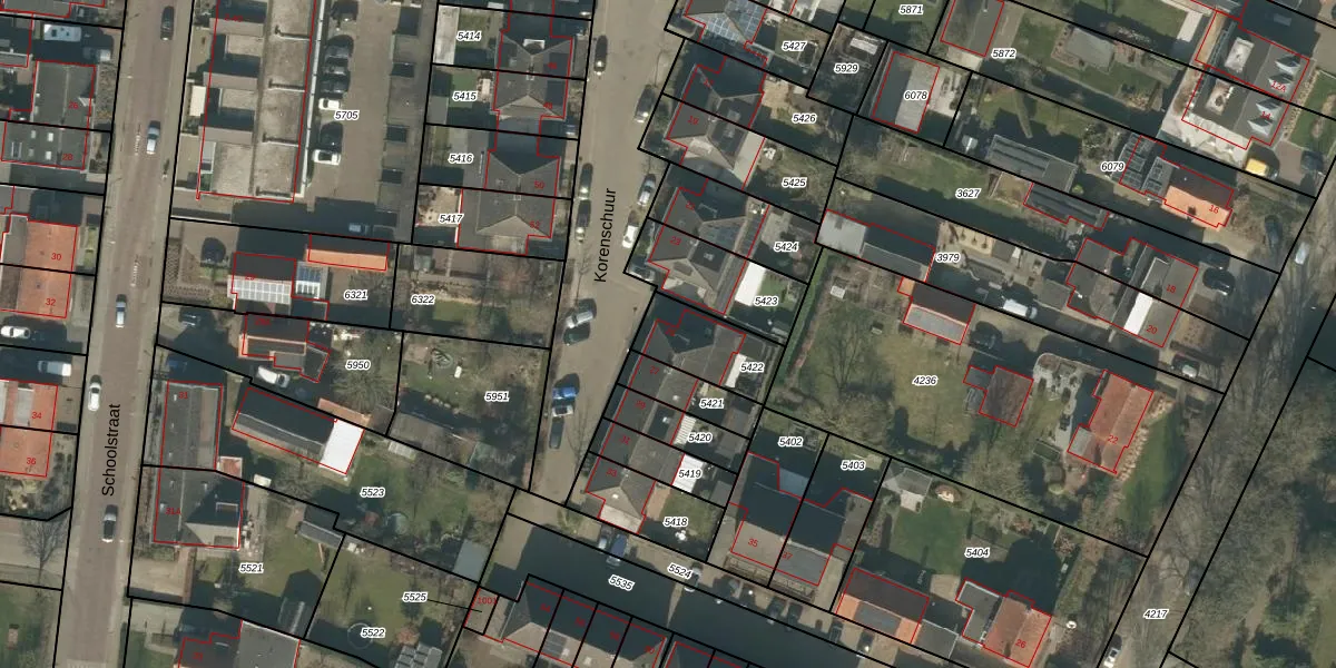 Het perceel waarop Korenschuur 25 staat heeft een oppervlakte van 202 m². Dit is een middelgroot perceel. De perceeloppervlakte wordt geregistreerd door het Kadaster. Gedetailleerde informatie over de maten van dit perceel kunt u vinden in het rapport Kadastrale kaart met maatvoering van Korenschuur 25.