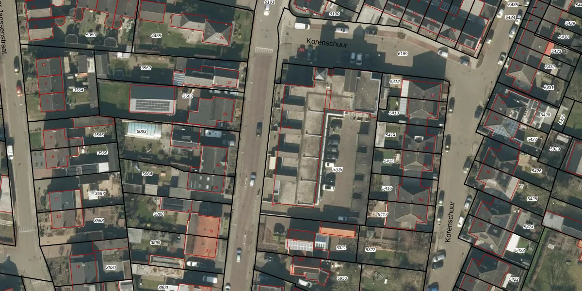 Korenschuur 30 is gelegen op kadastraal perceel MGT01A5705. Deze kadastrale aanduiding is uniek en wordt gebruikt door het Kadaster om eigendomsrechten en andere zakelijke rechten vast te leggen. Het perceel maakt onderdeel uit van de kadastrale gemeente Moergestel.