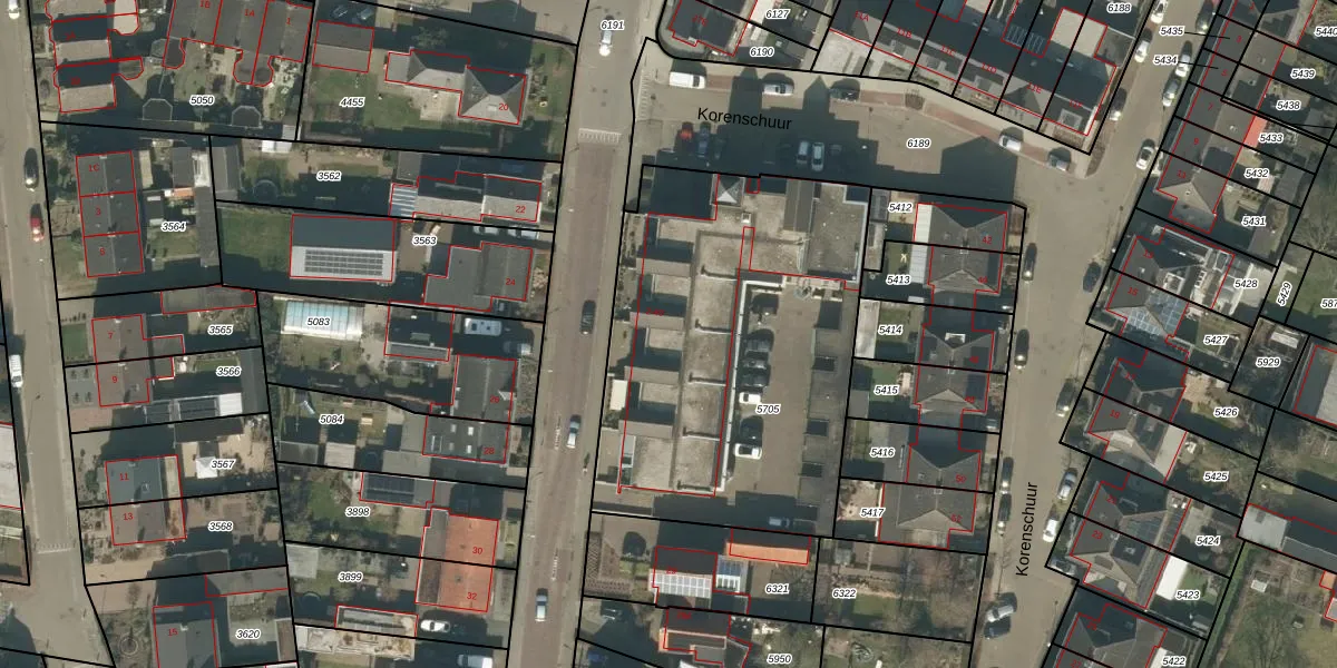 Het perceel waarop Korenschuur 34 staat heeft een oppervlakte van 1903 m². Dit is een zeer groot perceel. De perceeloppervlakte wordt geregistreerd door het Kadaster. Gedetailleerde informatie over de maten van dit perceel kunt u vinden in het rapport Kadastrale kaart met maatvoering van Korenschuur 34.